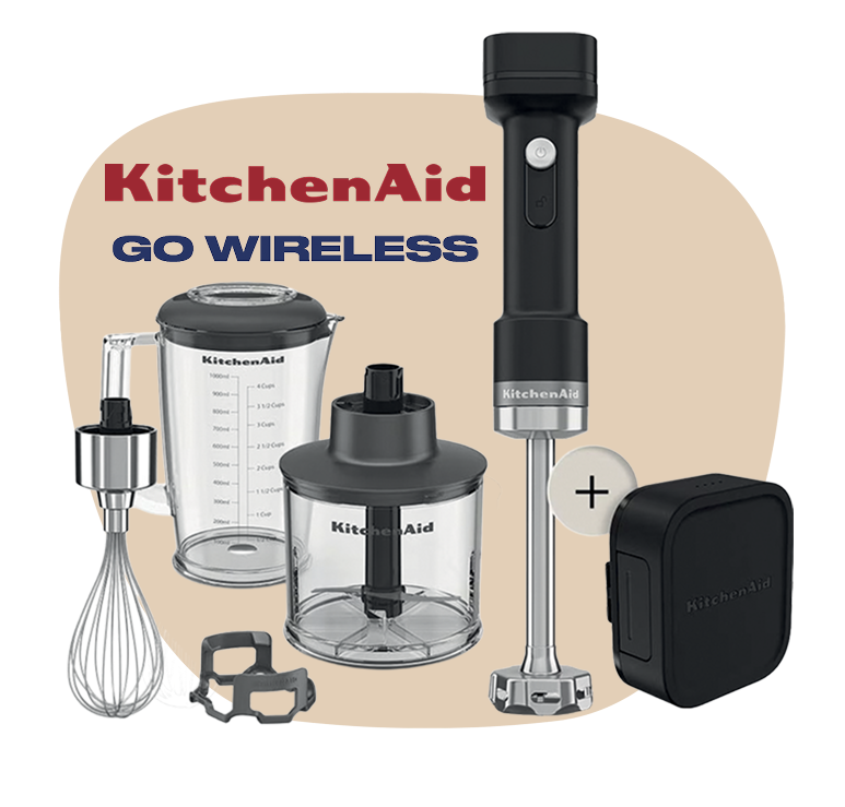 Frullatore ad immersione senza fili KitchenAid Go con accessori extra e batteria.